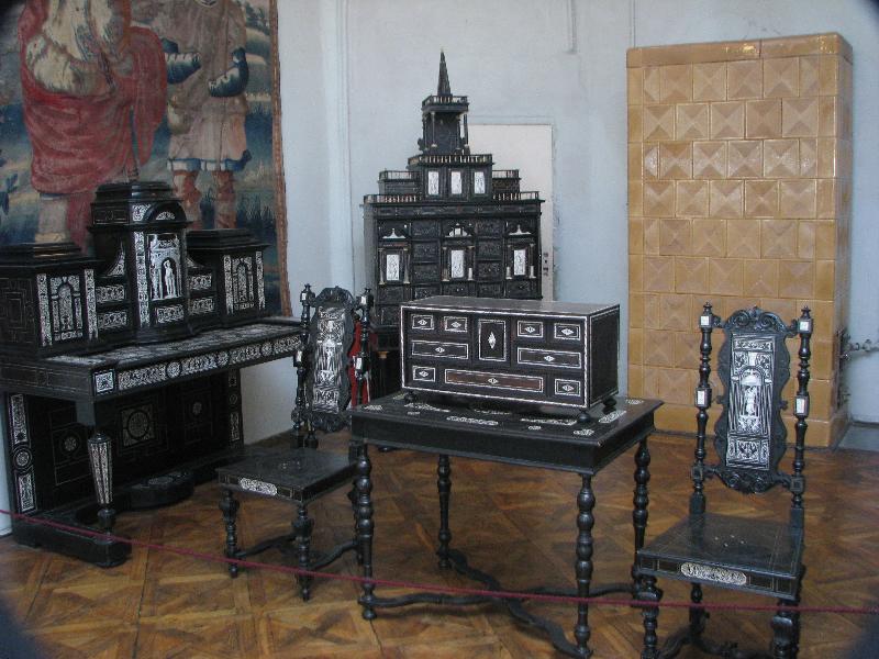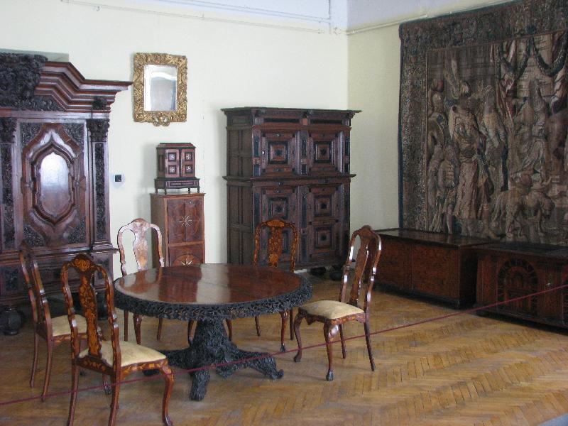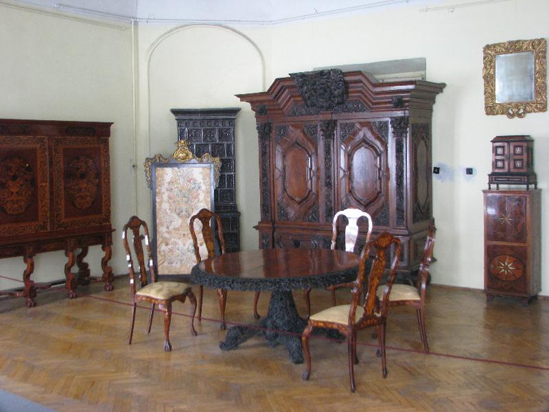 Експозиція нараховує 600 одиниць меблів, біля 12000 одиниць фарфору та фаянсу. Експонати розміщуються на двох поверхах. Перший поверх налічує 13 залів і представляє меблі та фарфор з 16 по 20 ст. На другому поверсі знаходиться 5 залів, у яких представлено українське мистецтво 18 – 19 ст., а також виставка П. Янинського „Кахель”.Тут зберігаються вироби минулих століть з Китаю, Японії, багатьох визначних фарфорових виробництв Європи. Гордість музею – зібрання української порцеляни кінця XVIII – XX ст. Особливу історико-художню цінність становлять вироби перших українських заводів у містечках Корець, Баранівка та Городниця.
