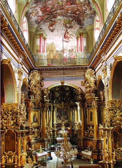 На склепінні головної нави церкви зображено апофеоз святого Франциска. В самому центрі склепіння на колісниці, запряженій двома парами білих румаків виїжджає св. Франциск, який нагадує пророка Іллю, що здіймається на небо. Під час реставрації 2004 року виявлено, що автор попередньо скомпонував зображення по-іншому й колісниця повинна була рухатися на глядача, але потім передумав й виконав теперішню композицію. Реставратори залишили контури первісного задуму і тепер зображення можна бачити поряд з остаточною формою. Колісницею, яка прямує до освітленого напису «Ягве», керують ангели; також цілу композицію оточує сонм ангелів.