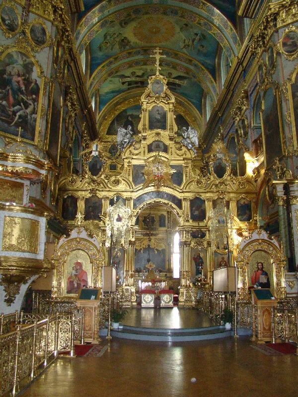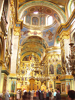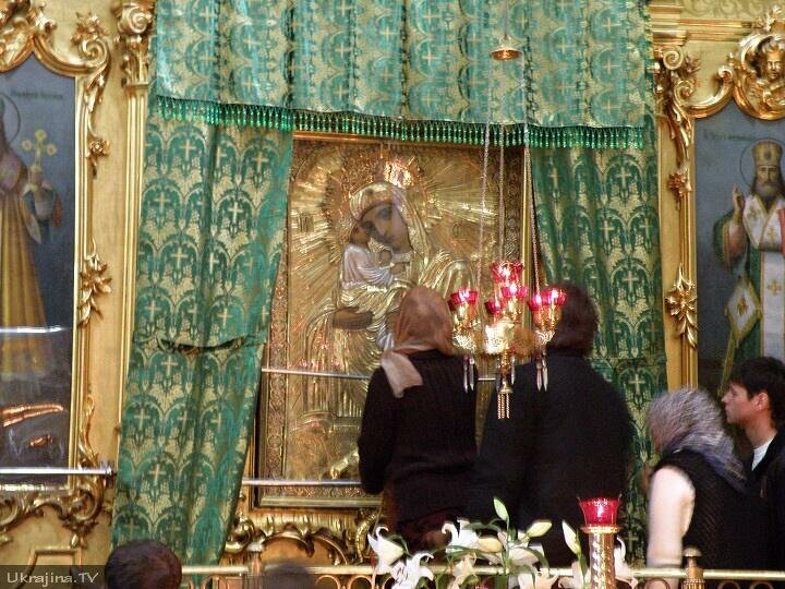 Храм відомий своєю чудовою акустикою. Щодо ікон, то в інтер‘єрі є деякі ще 1646 року, а головний іконостас був привезений з Москви. На "чудотворній" іконі оклад – золотий, з справжніми діамантами та рубінами. Ікона коронована одним з пап римських. В Лаврі є й печерна церква монаха Іова в справжній печері, там зберігаються його мощі.