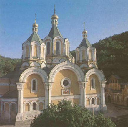 У центрі обителі побудовано у 1859-1868 рр. за проектом А. Горностаєва п‘ятибанний престольний храм, над Святими вратами – церква Покрови Божої Матері (1850-1851 рр., архітектор К. Тон). На заході – два братських корпуси, на сході – колишній Гостиний двір обителі (комплекс споруд, що отримав сучасний вигляд у 1900 р.). На північ від двору, коло підніжжя гори знаходиться підземний храм преп. Антонія та Феодосія Печерських; при вході на поверхню спорудили павільйон, біля нього заснували цвинтар для благодійників та нашановніших духівників монастиря; до початку 80-х рр. ХХ ст. павільйон було зруйновано, у 1993-1994 рр. відтворено підземний інтер‘єр; під залишками павільйону поховано князя Н. Б. Голіцина – учасника Вітчизняної 1812 р. та Кримської 1853-1856 рр. воєн, друга О. Пушкіна, письменника, перекладача, композитора (помер у 1866 р.).